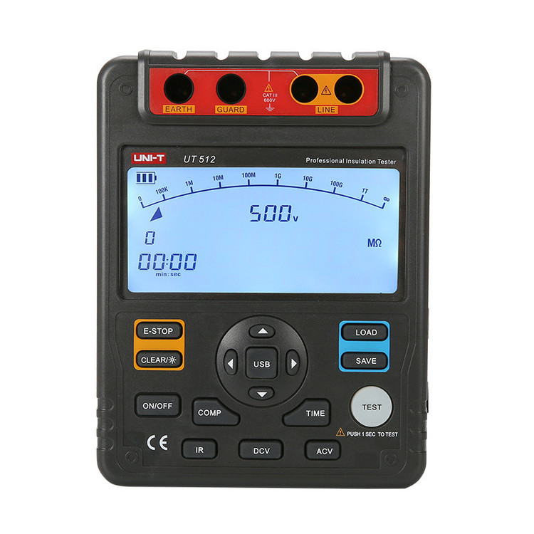 میگر تستر عایق یونیتی UNI-T UT512 یکی از دستگاه های تست عایق موجود در بازار می باشد که دارای کیفیت فوق العاده و قابلیت اندازه گیری مقاومت عایق از0.5MΩ تا 100GΩ می باشد. ولتاژ تست این کد محصول در 4 رنج 2500V/1500V/1000V/500V می باشد همچنین توانایی اندازه گیری ولتاژ متناوب را نیز دارد. میگر 2.5 کیلو یونیتی UNI-T UT512 دستگاهی کاربردی برای اندازه گیری مقاومت عایقی در انواع تجهیزات الکتریکی مانند عایق کابل ها، ترانسفورماتورها ، موتورها و …. مورد استفاده قرار میگیرد. این دستگاه میگر میتواند مقدار مقاومت را تا 200 گیگا اهم تحت ولتاژ تزریقی 2.5 کیلو ولت در چهار رنج اندازه گیری کند. دارای نمایشگر بزرگ به همراه نور پس زمینه و بار گراف بوده که مجهز به تایمر برای نشان دادن مقدار زمان اندازه گیری و دارای حالت اندازه گیری پیوسته است.این میگر متیواند شاخصه های PI و DAR را اندازه گیری کندو از ویژگی ها مهم آن میتواند قابلیت ذخیره 18 گروه داده و قابلیت اتصال آن به کامپیوتر را اشاره کرد. این میگر میتواند مقادار حد بالا وحد پایین مقادمت را مقایسه کرده و دارای دشارژ اتوماتیک برای ایمنی بیشتر کاربر است. برو روی نمایشگر آن نشانگر باتری و نشانگر های ولتاژ وجود دارد .